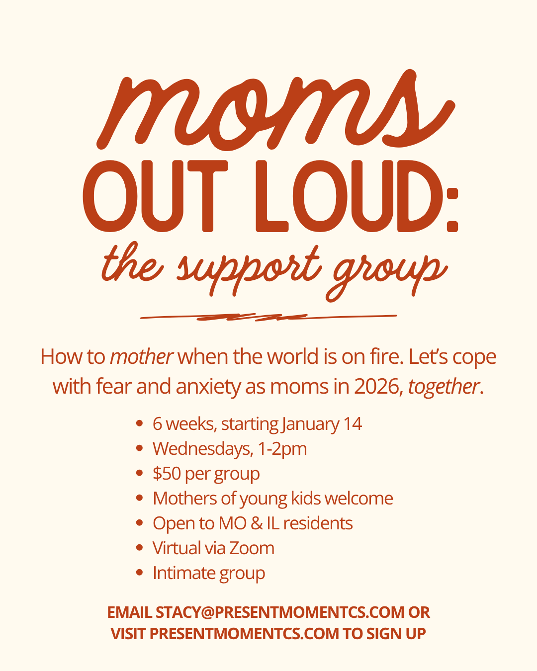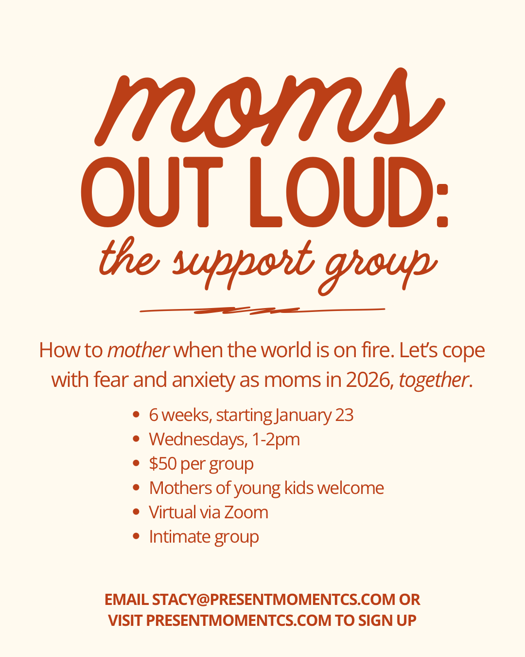 you’re tired of carrying your fears alone and want both support from your fellow moms and practical skills you can take home to feel stronger and more grounded.
